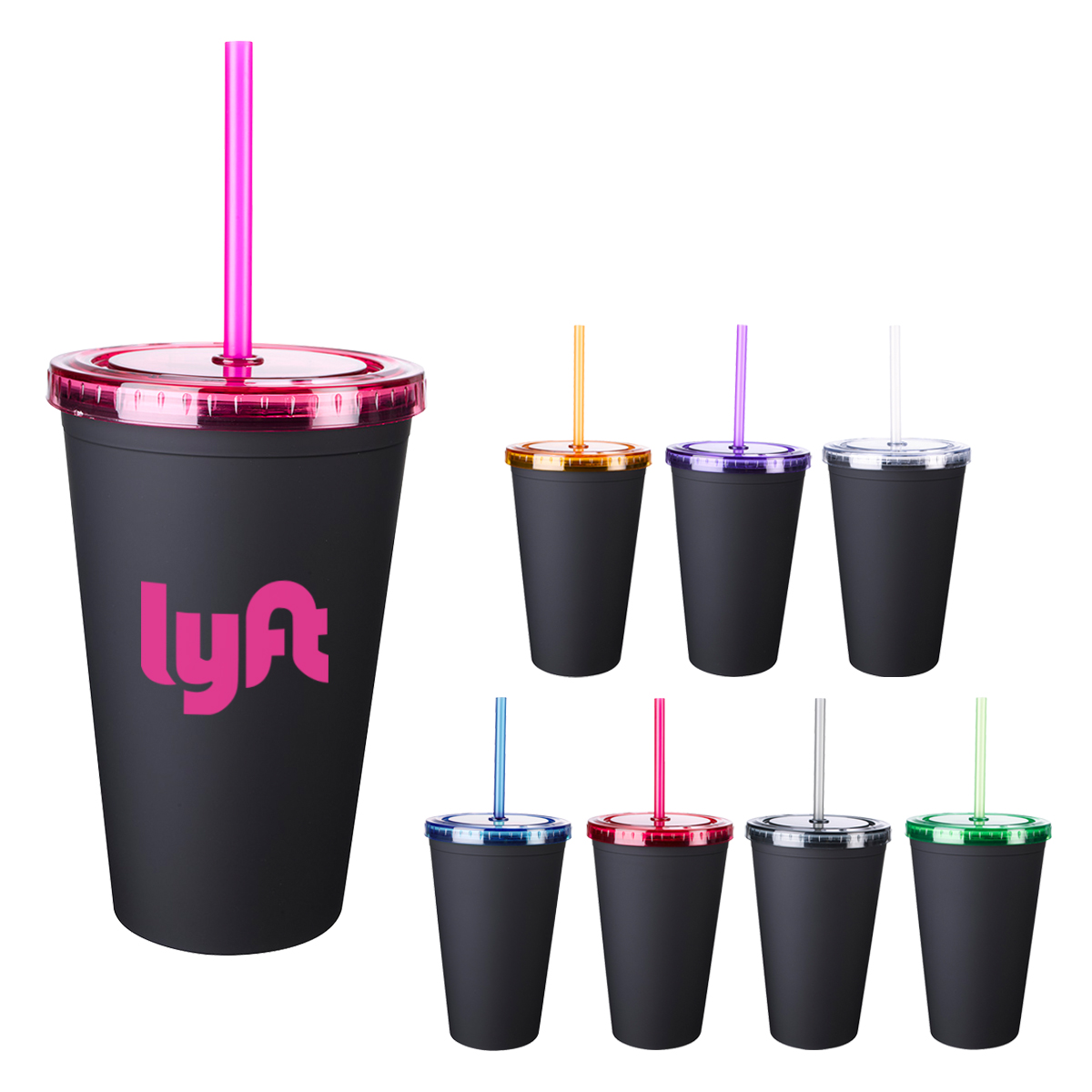 5958: Matte Black with Blue, Charcoal, Orange, Purple, Fuchsia, Green, Clear or Red Lid and Straw.