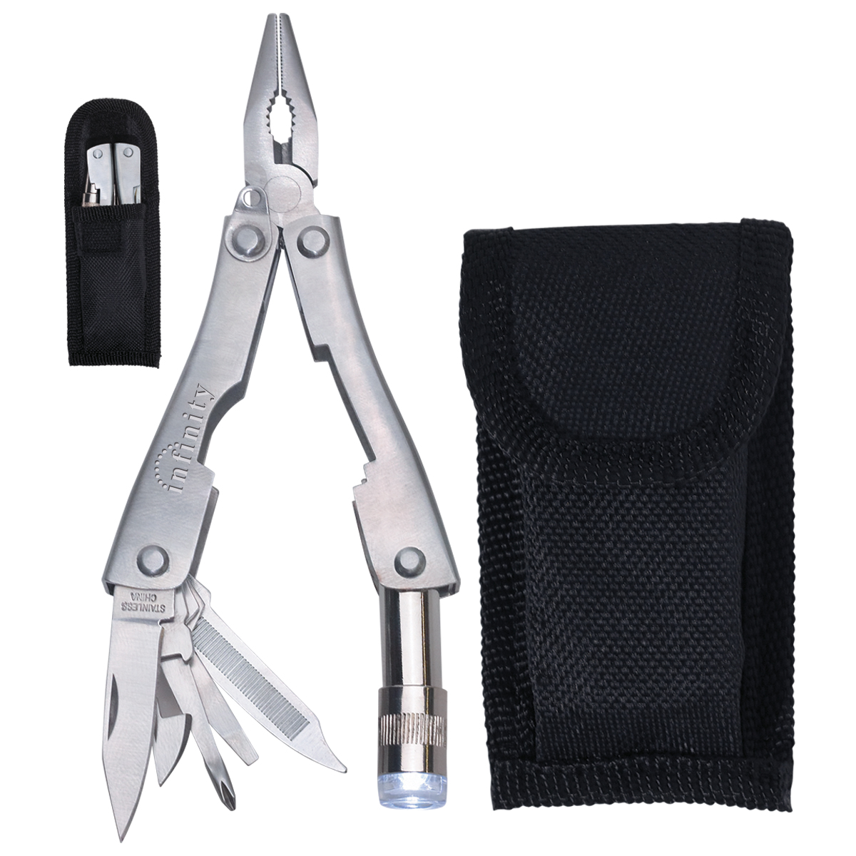 - Includes Needle Nose Pliers, Wire Cutter, Flat Head/Phillips Head Screwdriver, Twist Action LED Flashlight, Bottle Opener And File