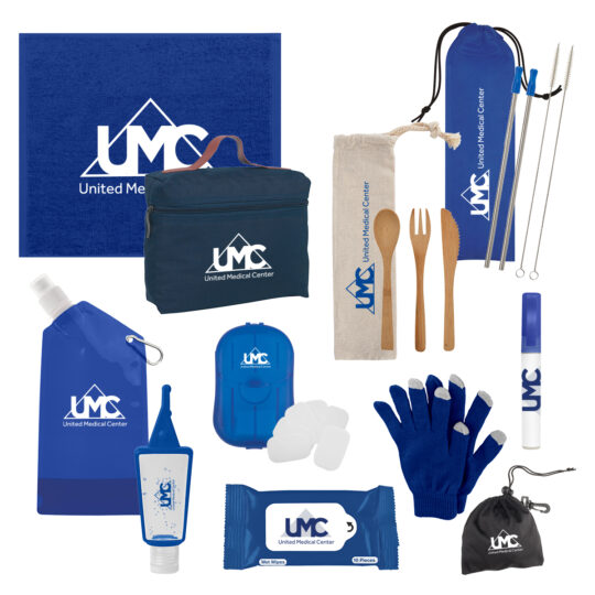 - Set Includes #5215 – 2 Pack Stainless Steel Straw Kit, #2950 Touch Screen Gloves In Pouch, #5800 – 28 Oz. Collapsible Bottle, #2421 – 3 Piece Bamboo Utensil Set In Travel Pouch, #6080 Rally Towel, #9054 – 1 Oz. Hand Sanitizer In Silicone Holder, #9058 – .27 Oz. Hand Sanitizer Spray Pump, #9043 Wet Wipe Packet, #9302 Hand Soap Sheets In Compact Travel Case and #9458 Cosmo Bag