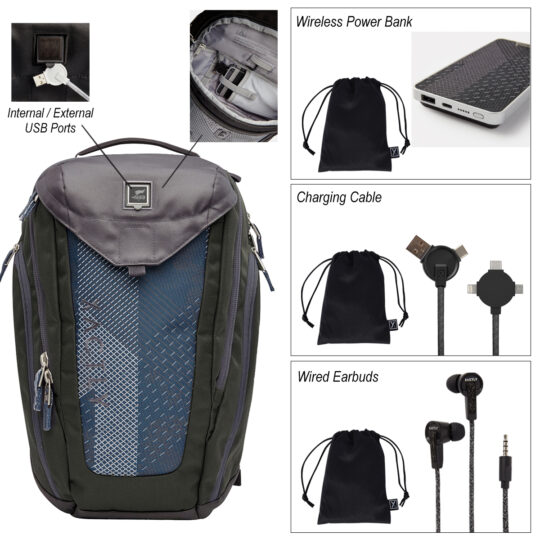 - Bundle Includes #9661 Oxygen 35 – 35L Backpack, #9668 Lithium – 10,000 mAh Qi Wireless Power Bank, #9669 – 5 Ft. 3-In-1 Lithium CC – Charging Cable And #9667 Krypton Wired Earbuds With Pouch