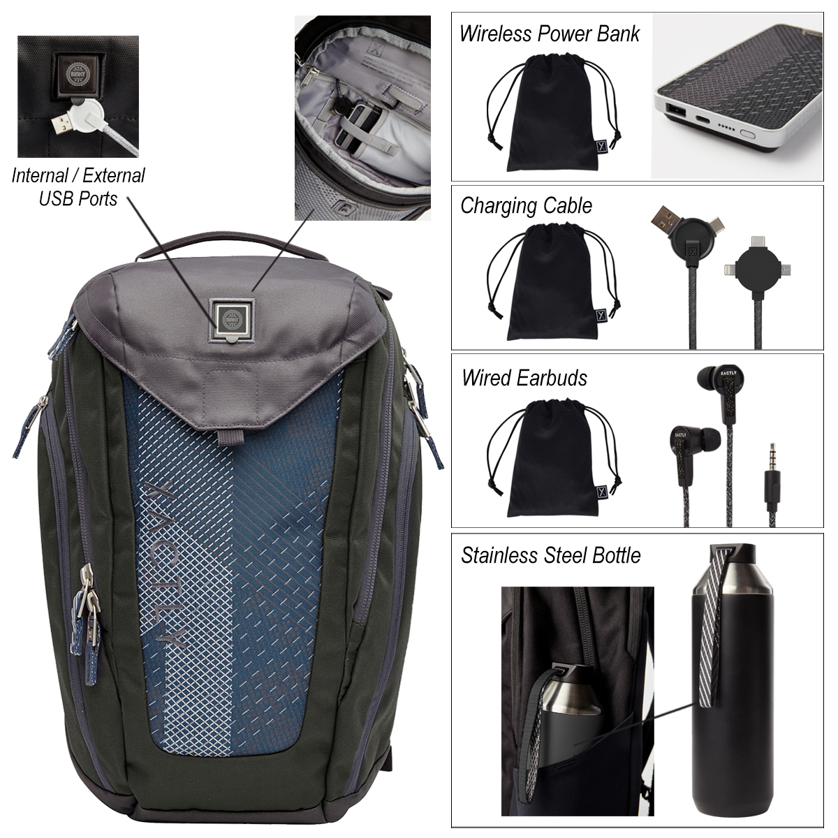 • Bundle Includes #9661 Oxygen 35 – 35L Backpack, #9668 Lithium – 10,000 mAh Qi Wireless Power Bank, #9669 – 5 Ft. 3-In-1 Lithium CC – Charging Cable, #9667 Krypton Wired Earbuds With Pouch And #9664 Hydrogen 20 – 20 Oz. Stainless Steel Water Bottle