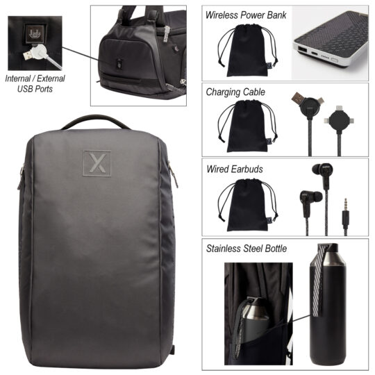 - Bundle Includes #9662 Oxygen 45 – 45L Hybrid Backpack Duffel, #9668 Lithium – 10,000 mAh Qi Wireless Power Bank, #9669 – 5 Ft. 3-In-1 Lithium CC – Charging Cable, #9667 Krypton Wired Earbuds With Pouch And #9663 Hydrogen 32 – 32 Oz. Stainless Steel Water Bottle