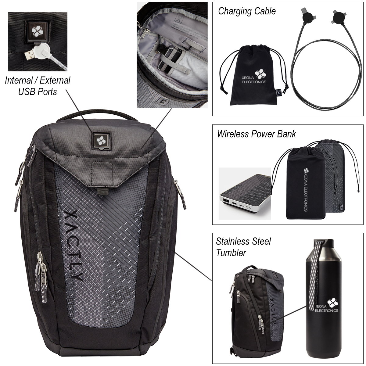 - Kit Includes #9661 Oxygen 35 – 35L Backpack, #9669 – 5 FT. 3-In-1 Lithium CC – Charging Cable, #9668 Lithium – 10,000 mAh QI Wireless Power Bank and #9664 Hydrogen 20 – 20 Oz. Stainless Steel Water Bottle