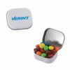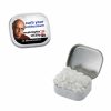 - This miniature upscale hinged tin comes filled with mints, candy, or gum and is printed with a 4-color process laminated decal or a 1-color direct imprint. Other fills: Sugar-Free Mints, Signature Peppermints, Cinnamon Red Hots, Gum, Colored Candy, or Chocolate Littles (M&M-type candy)