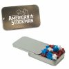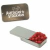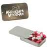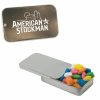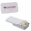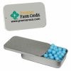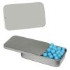 • This innovative Slider Tin can be filled with signature peppermints, red hots, gum, candy hearts, candy stars, sugar free peppermints, colored candy, chocolate littles, and sugar free gum. Comes with a 4-color process laminated decal or a 1-color direct imprint
